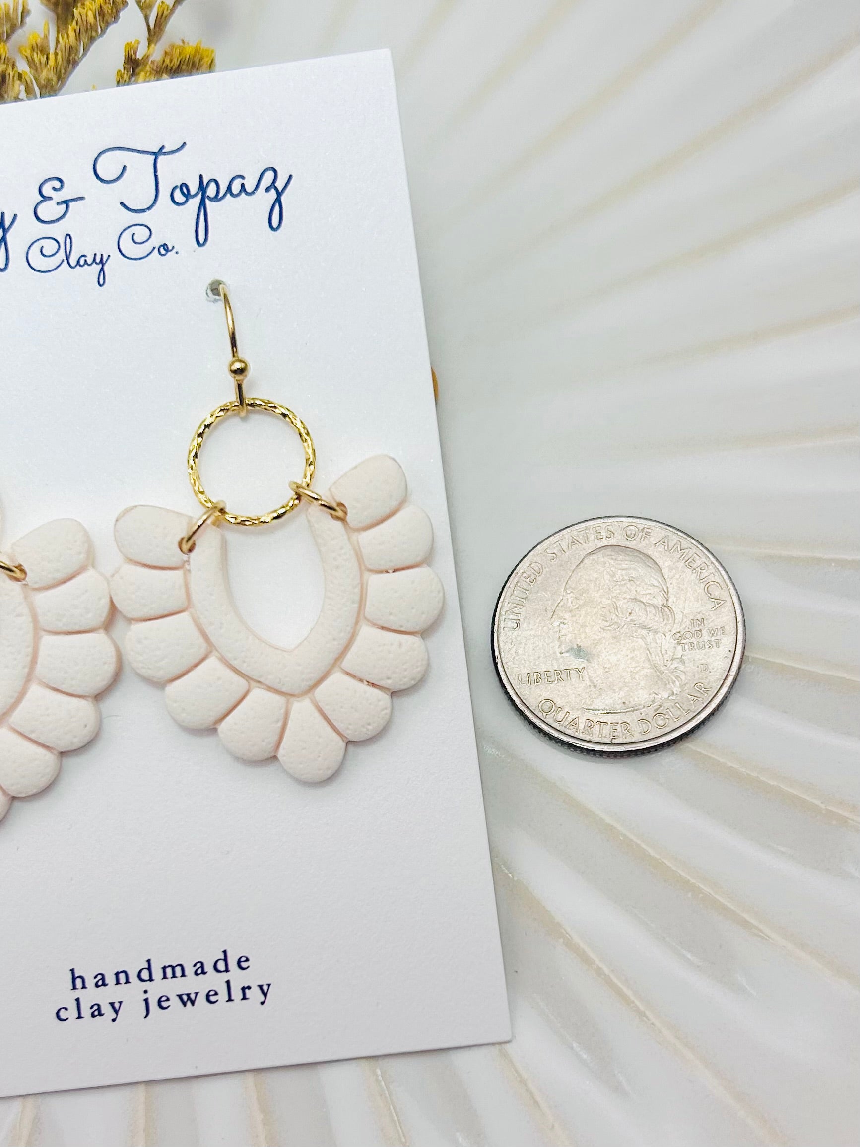 Amanda hangs from an 18k gold plated hook. The earring measures about 1.50 inches (38mm) from the top of the hook to the bottom of the earring. The width of the earring is about 0.9 inches (23mm) at the widest point.